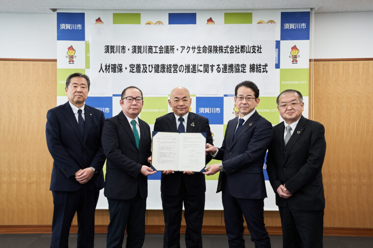 この度、須賀川商工会議所(会頭:菊地大介)は、令和8年3月12日、須賀川市およびアクサ生命保険株式会社郡山支社との三者間において、「人材確保・定着及び健康経営の推進に関する連携協定」を締結いたしました 。